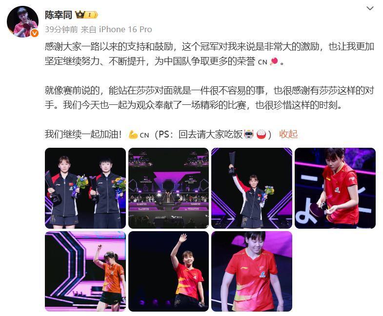 赛后,陈幸同在社交媒体上发表了感言。她特别感谢了团队的支持和对手的激励,两次提及孙颖莎的名字,将个人突破归功于集体力量。这种谦逊的姿态与当下体坛某些选手夺冠后的张扬表现形成鲜明对比,彰显了优秀运动员应有的格局与风范。
