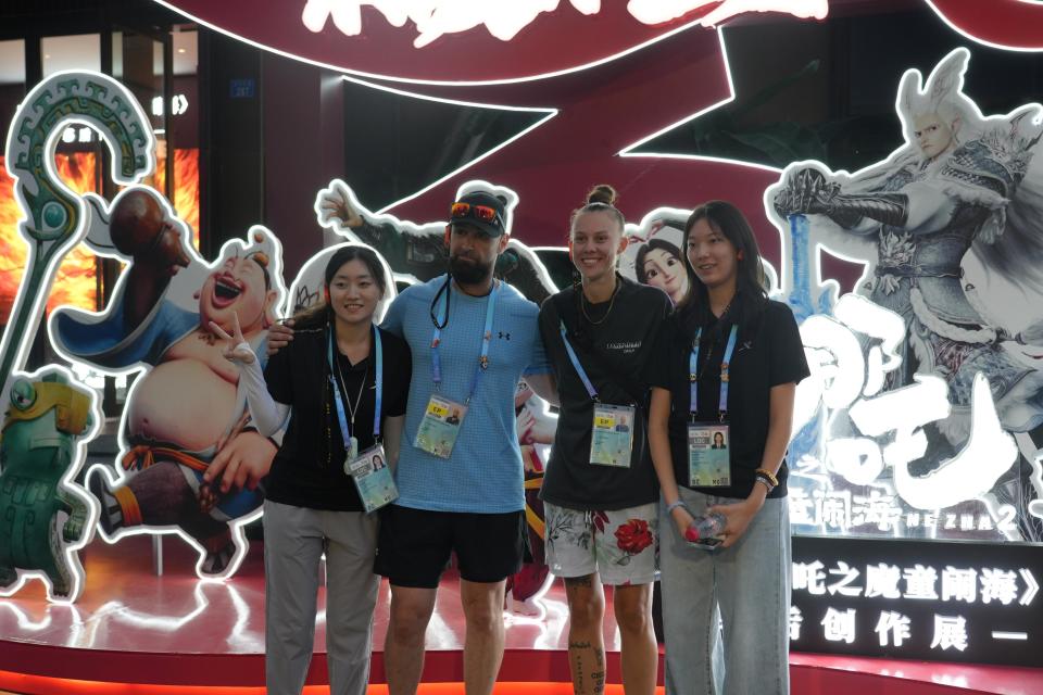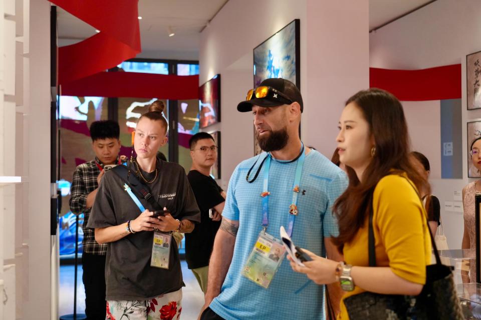 埃内斯托和凯利参观了设在交子书院的《哪吒之魔童闹海》幕后创作展,凯利饶有兴致地拍下了导演的绘制手稿。随后他们被双塔吸引,往娇子之环的方向漫步。中途广场上正在排练的啦啦队吸引了他们的注意,两个人好玩地加入了啦啦队的排练。